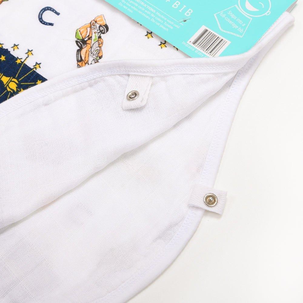 - Perfect transitional item. It can be used as a burp cloth in the early months, and then it snaps to convert into a full coverage bib once solid foods are introduced.