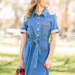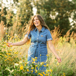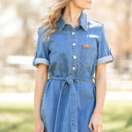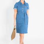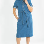 The Ada Denim Midi Dress is your go-to for modest charm with a twist of timeless flair. It sports rolled button sleeves, a practical front bodice, and a detachable belt that shapes your silhouette just right. Made in a classic denim wash and equipped with handy pockets, this laid-back dress is perfect for pairing with sneakers or boots, making everyday style a breeze!