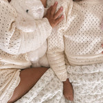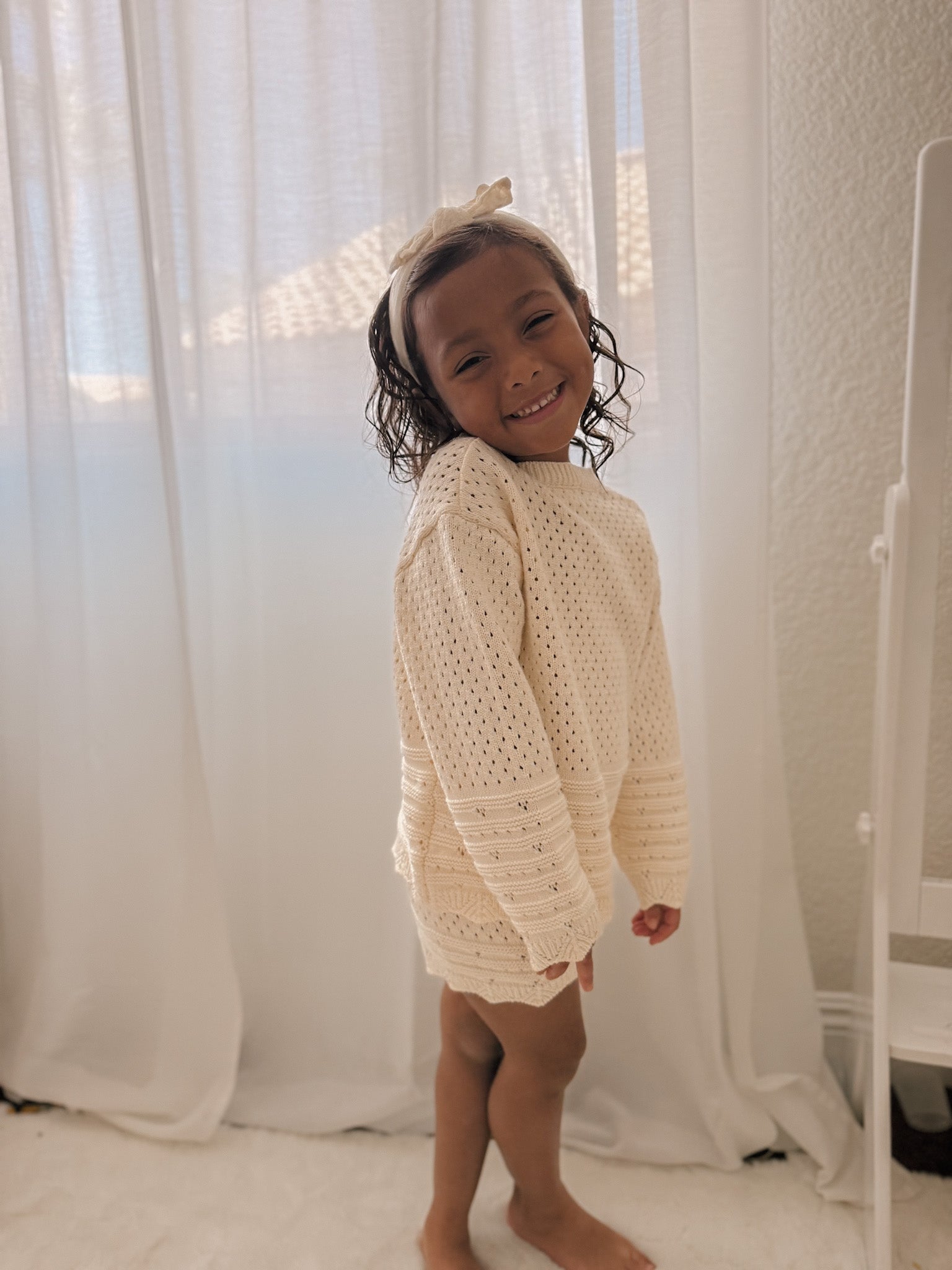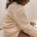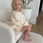 This summertime knit top and short set makes the perfect outfit for your free-spirited child. Inspired by beachy, boho, crochet, this set combines elegance and playfulness. The light weight sweater features delicate scalloped edges, with rows of pointelle knit detailing which adds a touch of texture and refinement to the design. The matching shorts offer a relaxed fit, allowing for plenty of movement while maintaining a chic, stylish look. Whether for playtime or a casual outing, this set is a timeless choice that combines sweet details with effortless style.
