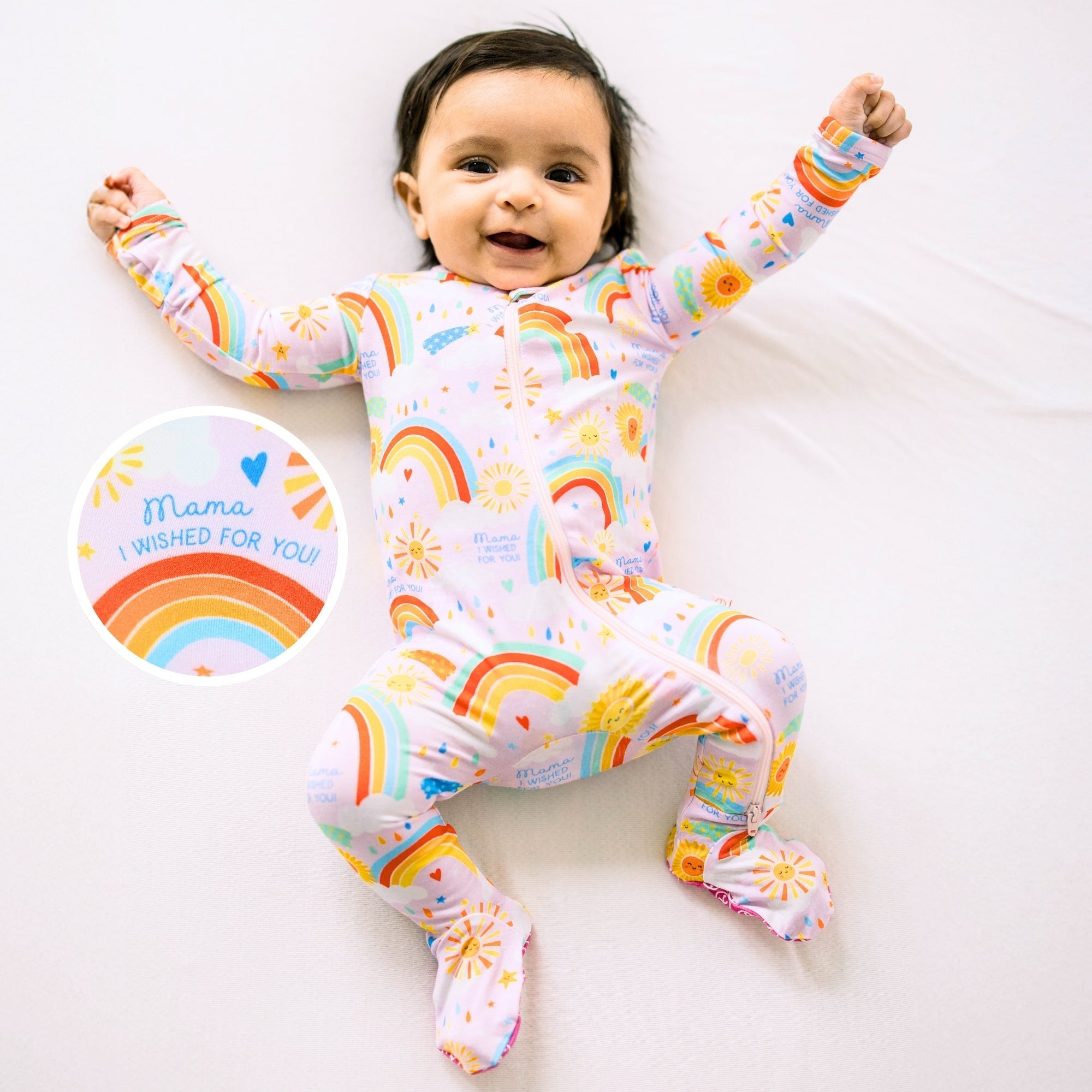 This footie zippered one piece was made with mama in mind. Bespoke, hand-drawn prints are crafted into buttery soft baby pajamas to comfort a tired and struggling mama and spark some joy in her day.