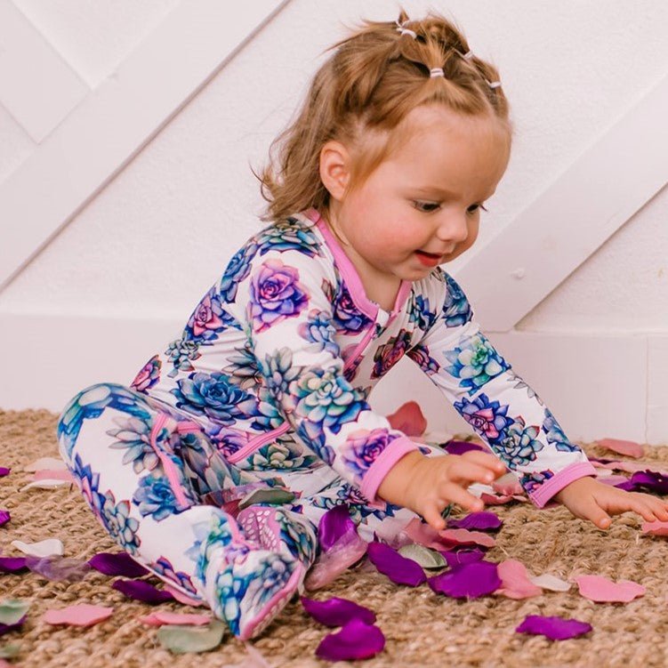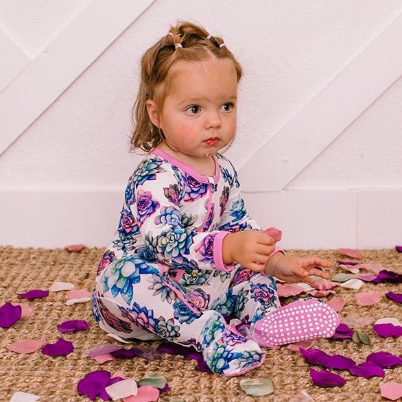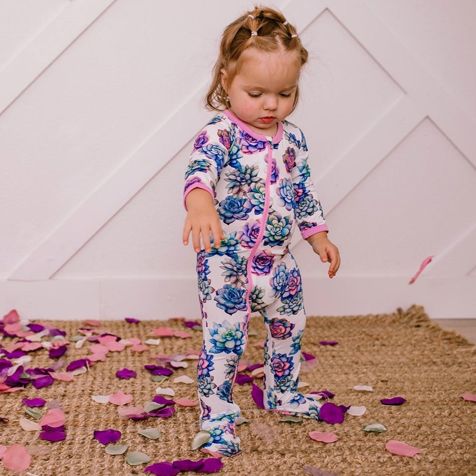 Introducing our succulent footie for your little one! Made of soft bamboo, the footie features a charming succulent print and dual 2-way zipper for easy diaper changes. The NB and 0/3m sizes also come with fold over mittens while larger sizes have foot grips for extra warmth. Soft, cozy, and adorable!
