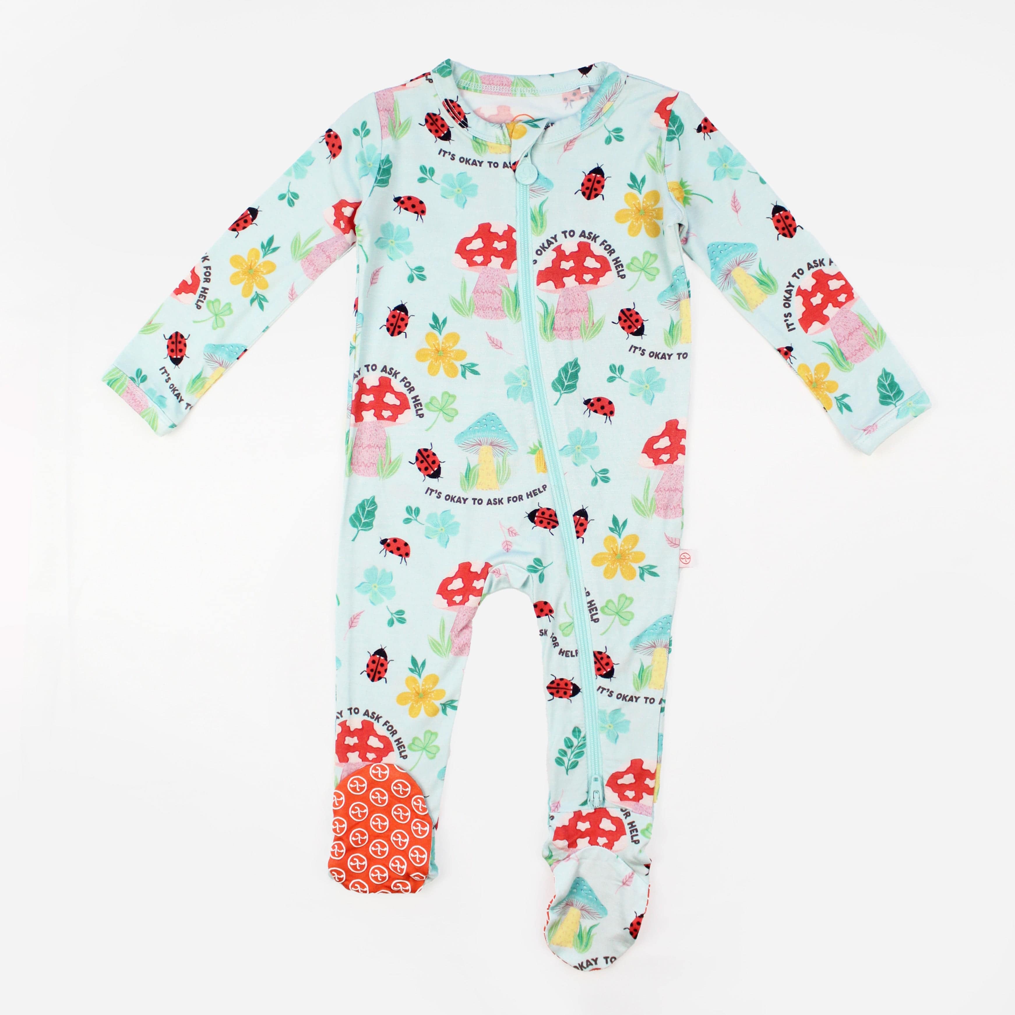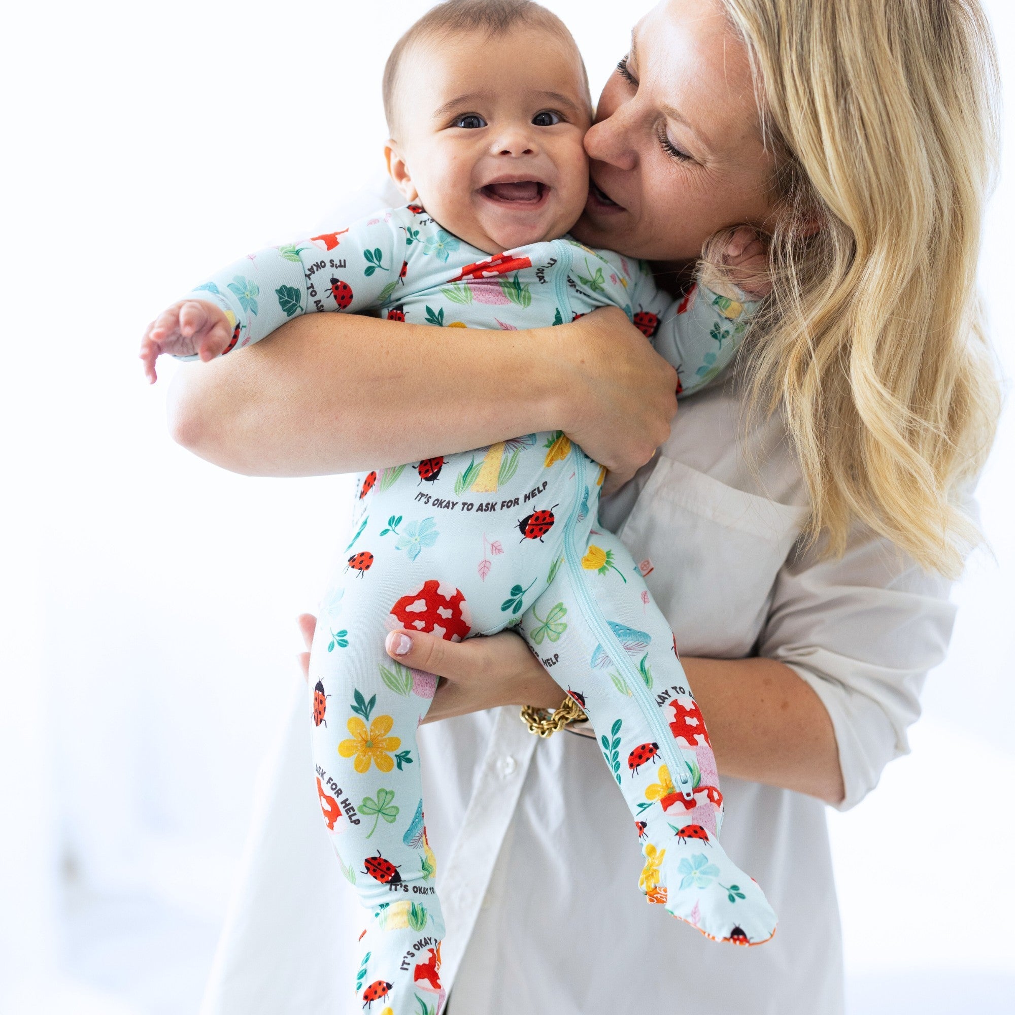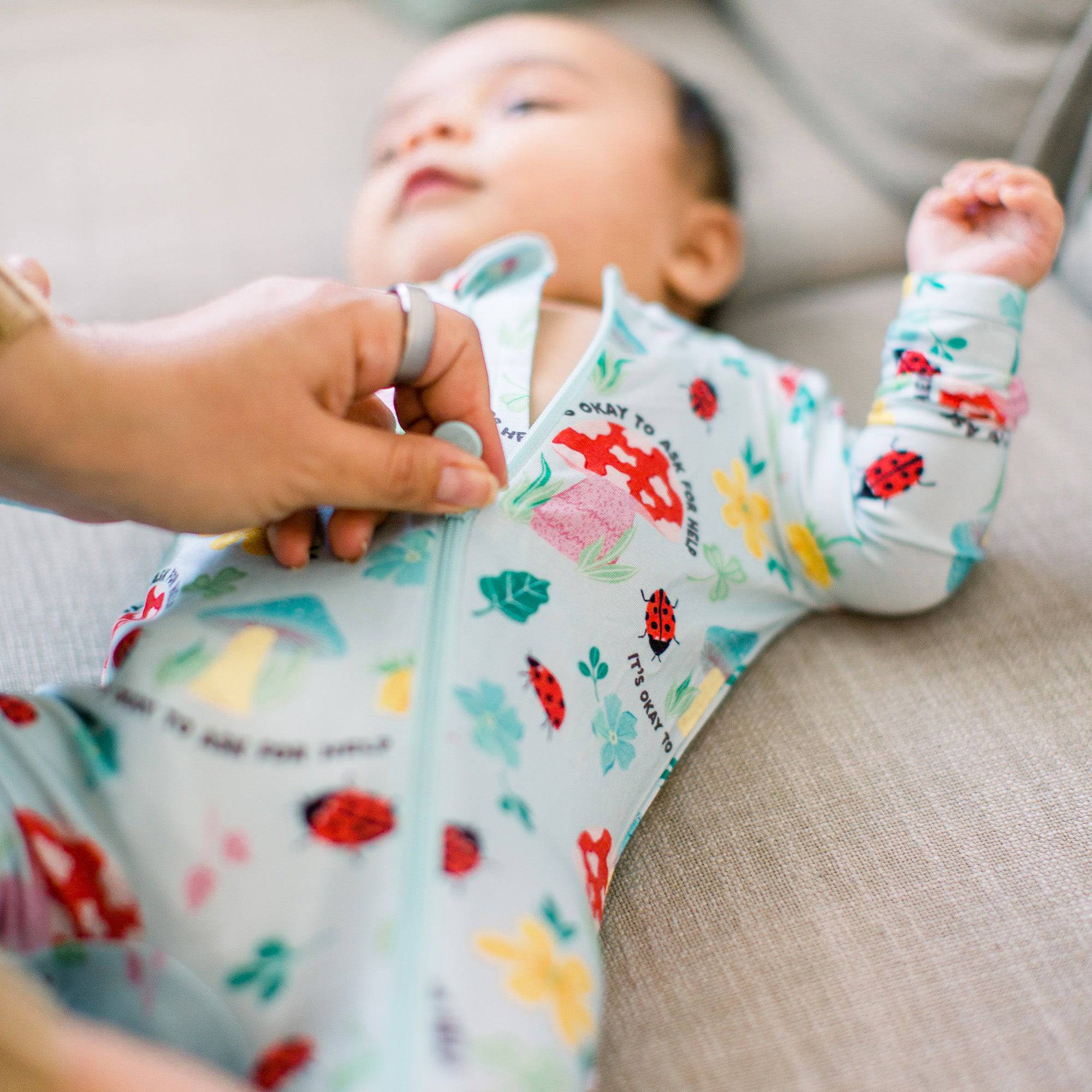 This footie zippered one piece was made with mama (or dada) in mind. Our bespoke, hand-drawn prints are crafted into buttery soft baby pajamas to comfort a tired and struggling mama and spark some joy in her day.