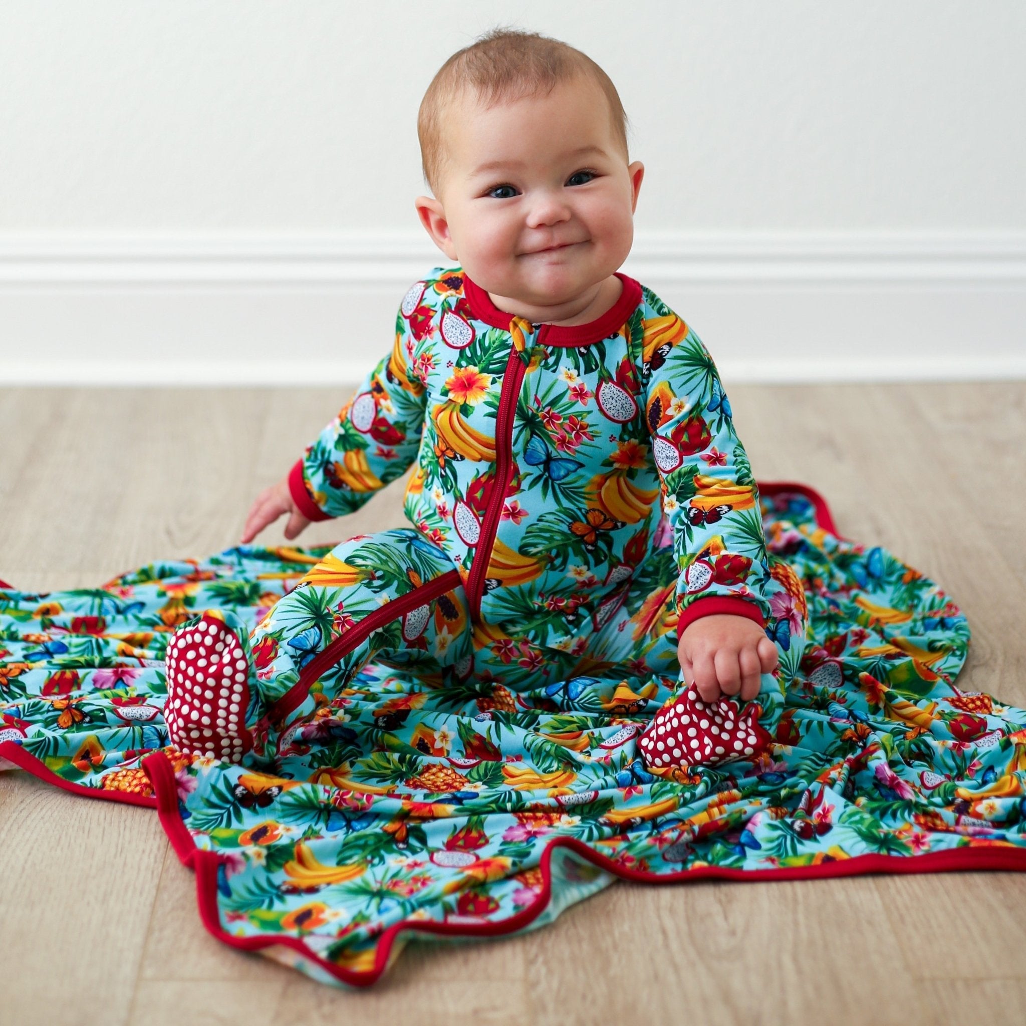These amazingly soft tropical fruit footies will keep little one's super cozy and snuggly from top to bottom! These soft as a baby's bottom footies are perfect for year round lounging. Zipper from neckline to those adorable little chubby feet make for easy breezy changing. We also made sure to add built in fold over hand mittens on small sizes to prevent scratching and worry free zip tabs to keep zippers away from little chins.