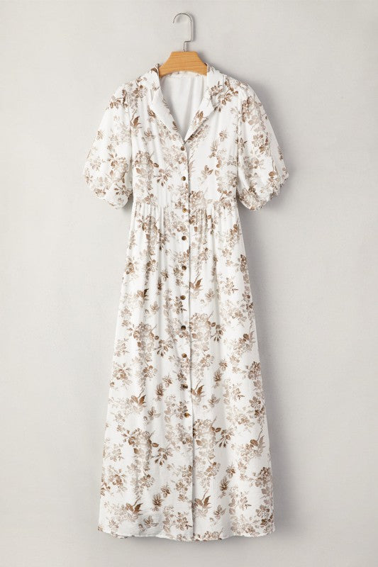 Step into effortless elegance with this maxi dress that's as fun as it is flattering. The chic V-neckline and half puff sleeves add a touch of charm, while the buttoned front closure gives you easy styling options. Designed to celebrate your curves in all the right ways, this lightweight and flowy number keeps you comfortable from morning to night. Perfect for everything from casual outings to special occasions, because looking fabulous should feel amazing too!