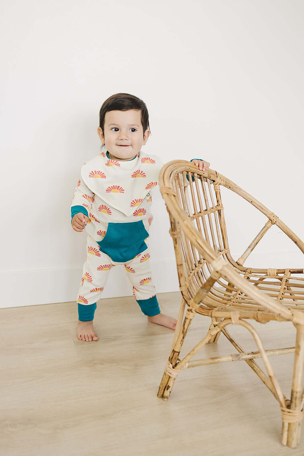✓ Cheerful Design - Sunny sunrise pattern printed with GOTS approved low-impact dyes brightens any day while hiding inevitable play-time spills.