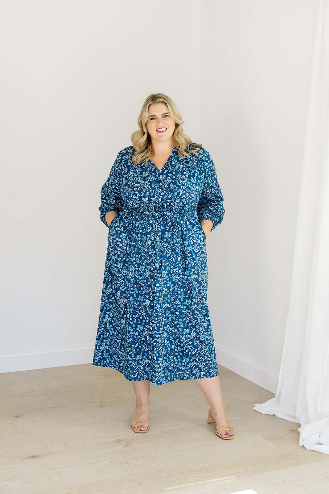If you want a holiday dress you can wear long after the holidays, The Savana is for you. This effortlessly flattering midi features our custom Winter Blossom print — a deep, cool blue floral that feels both timeless and fresh.