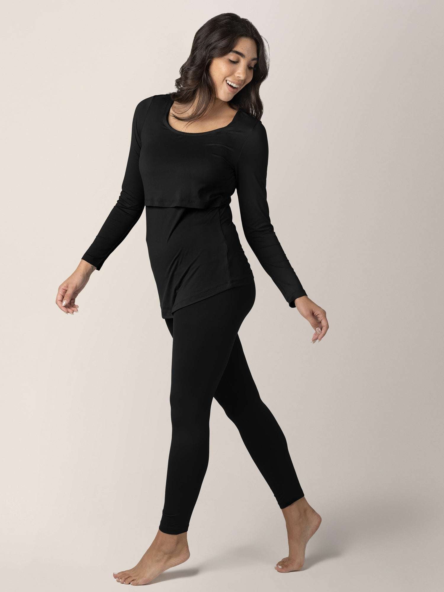 The nursing pajamas or “long janes” of your dreams. The snug silhouette comfortably fits under other clothes to keep you warm, and the nursing panel makes it easy to feed your little one at home or on the go.