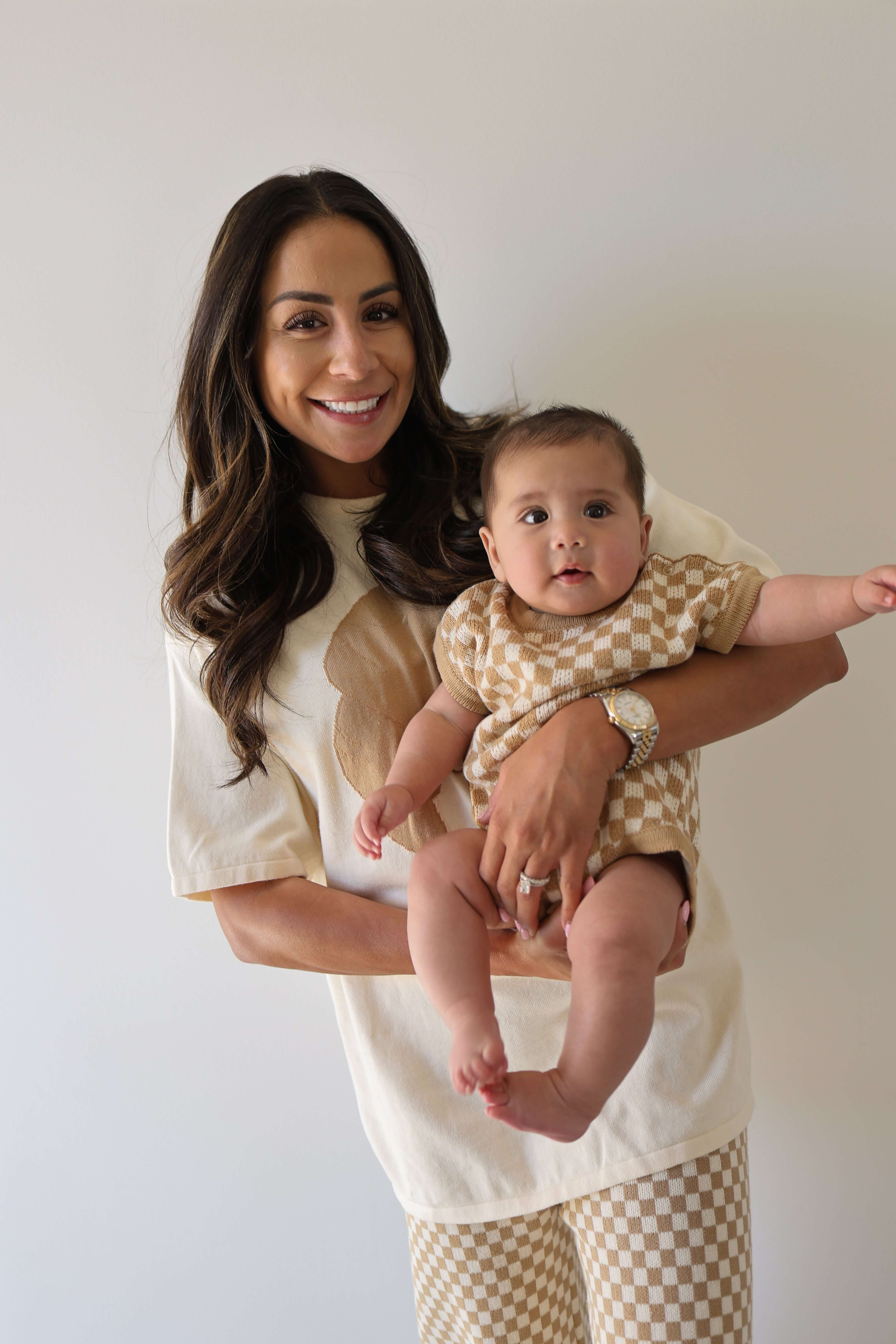A sweet everyday piece featuring soft knit fabric and a warm neutral checkerboard print. Designed with snap closures for easy diaper changes and all-day comfort.
