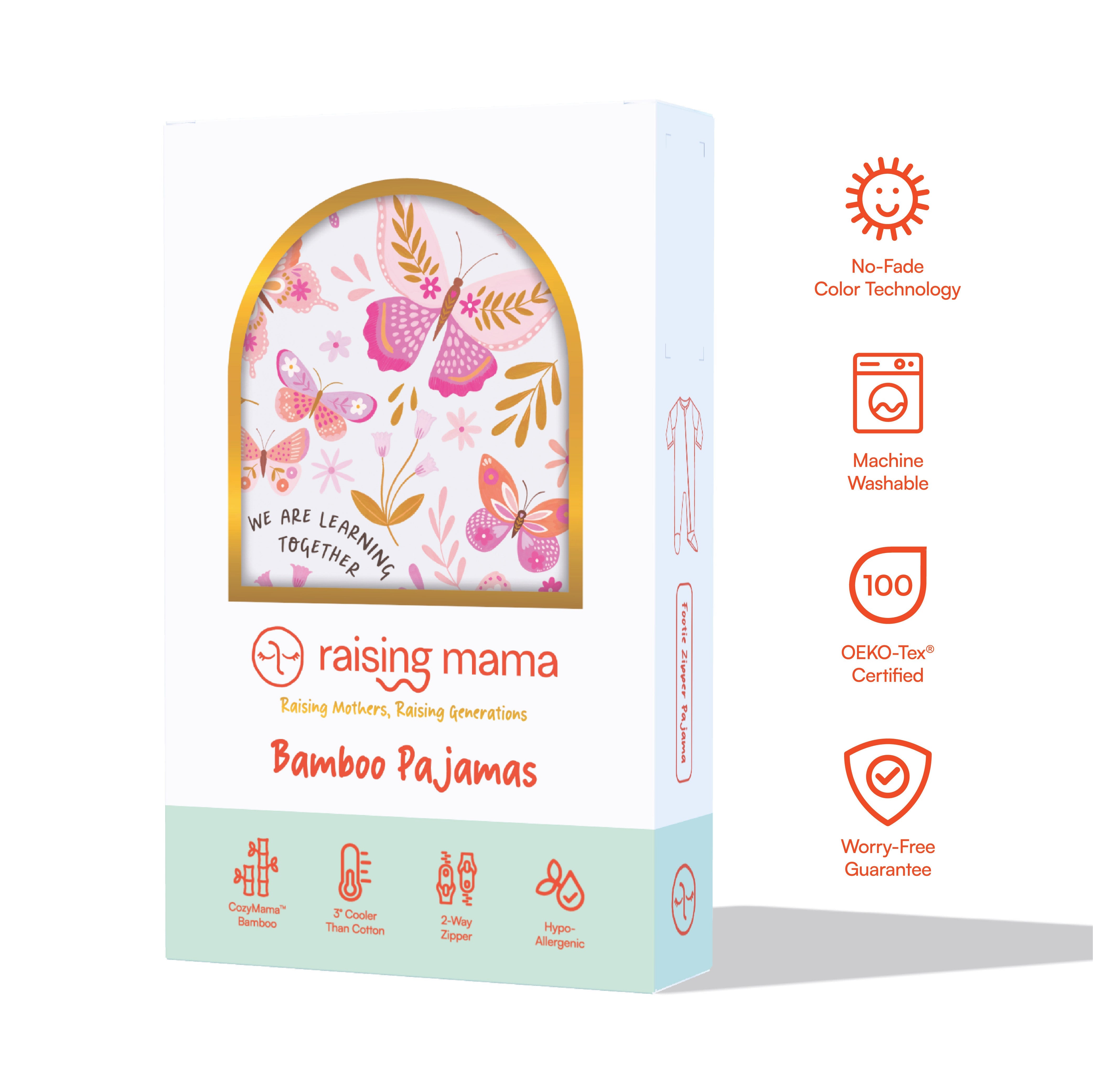Outfitted with signature Raising Mama® "mama-at-peace" footie grips, this bamboo baby sleeper has elastic backing on the footies for a snug fit, and will hug those baby chubs for extra cozy snuggles. Sizes NB and 0-3M have warm fold-over mittens which help reduce accidental scratches.