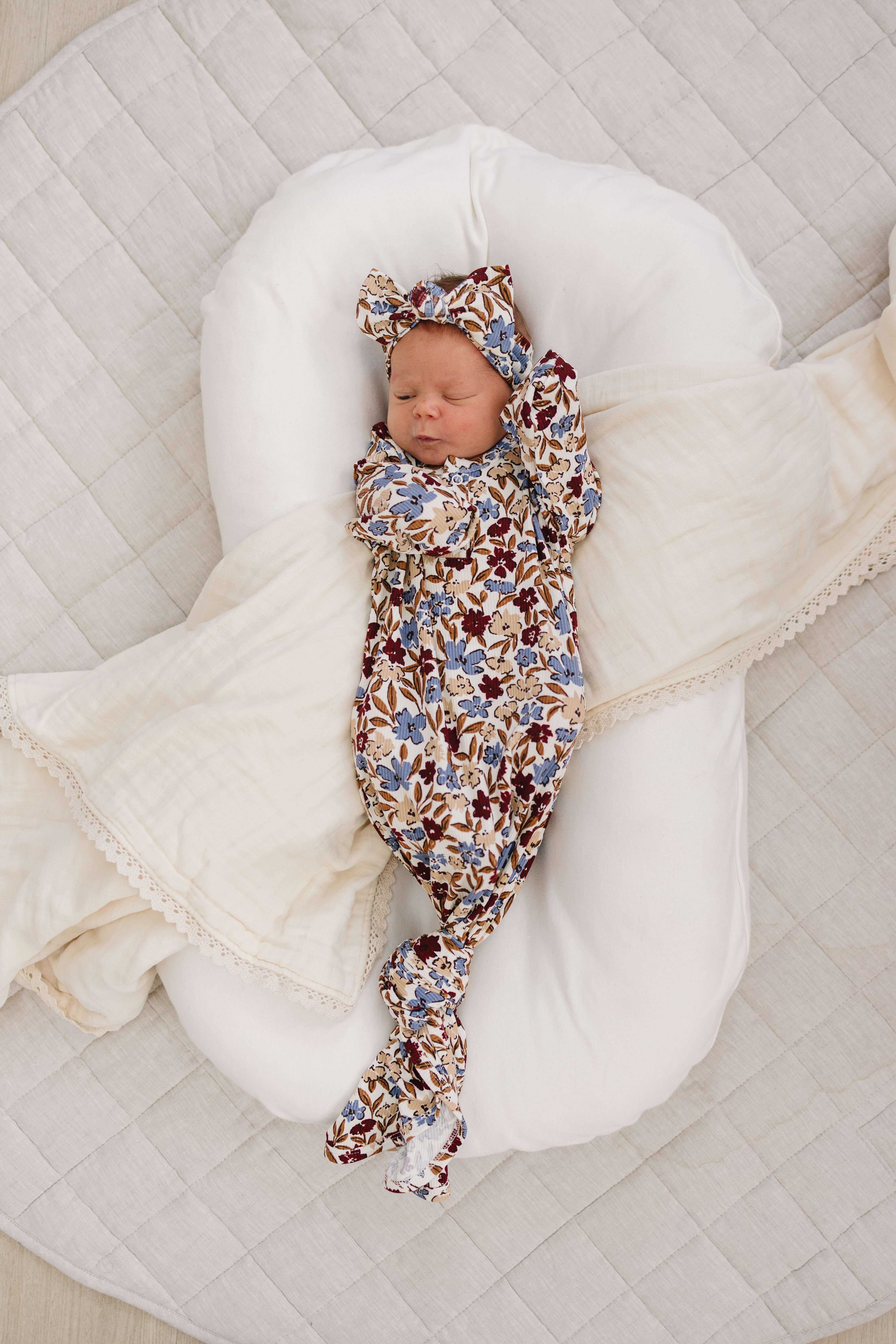 These gowns are size 0-3. They are made out of supremely soft Bamboo Rayon to keep your little one comfortable. We have a variety of gender neutral designs and colors making them perfect for any baby. They have fold over hands and two snaps for easy on and off. We also have shoulder flaps to make it easily pull over your little ones head, we want to make dressing your baby as easy as possible. The bottom is easily tied and untied in a knot for no-fuss diaper changes which makes it a newborn baby essential! These are made out of the same fabric as our stretch swaddles and match the colors of the stretch swaddles, head wraps, and hats.