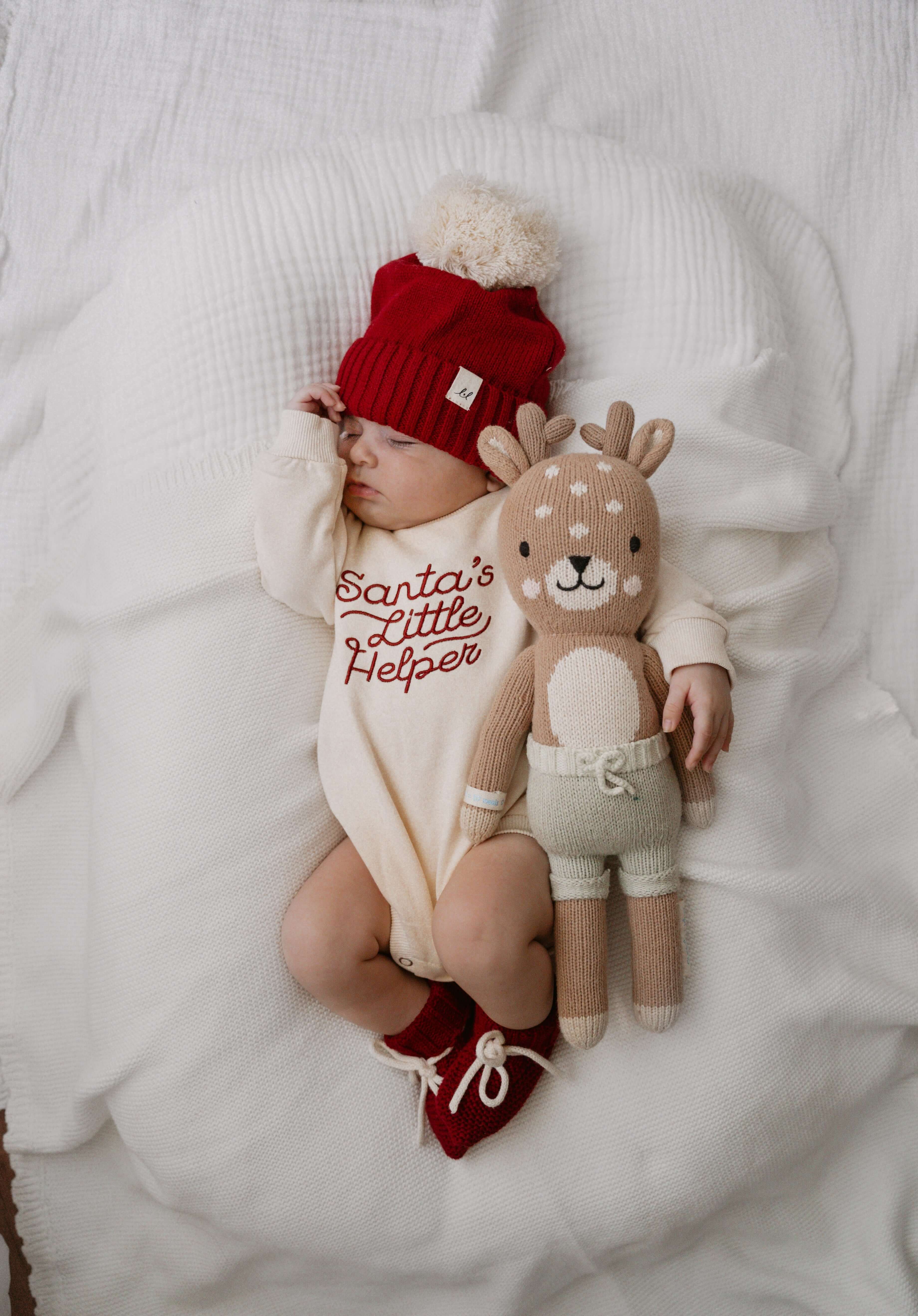 Santa's Little Helper Romper matches our Luna + Luca Pom Beanie in Holly and the Luna + Luca Organic Booties in Holly