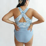 M.F. (Germantown, US) Obviously shopping online for a swimsuit is always a gamble. The material is very thick which I would have turned down right away in store. I’m between sizes and should have sized up. I don’t have a long torso or large chest so I thought a large would do. Nope. While I wear a size 12 normally postpartum, those cris cross straps in the back said no way ma’am.