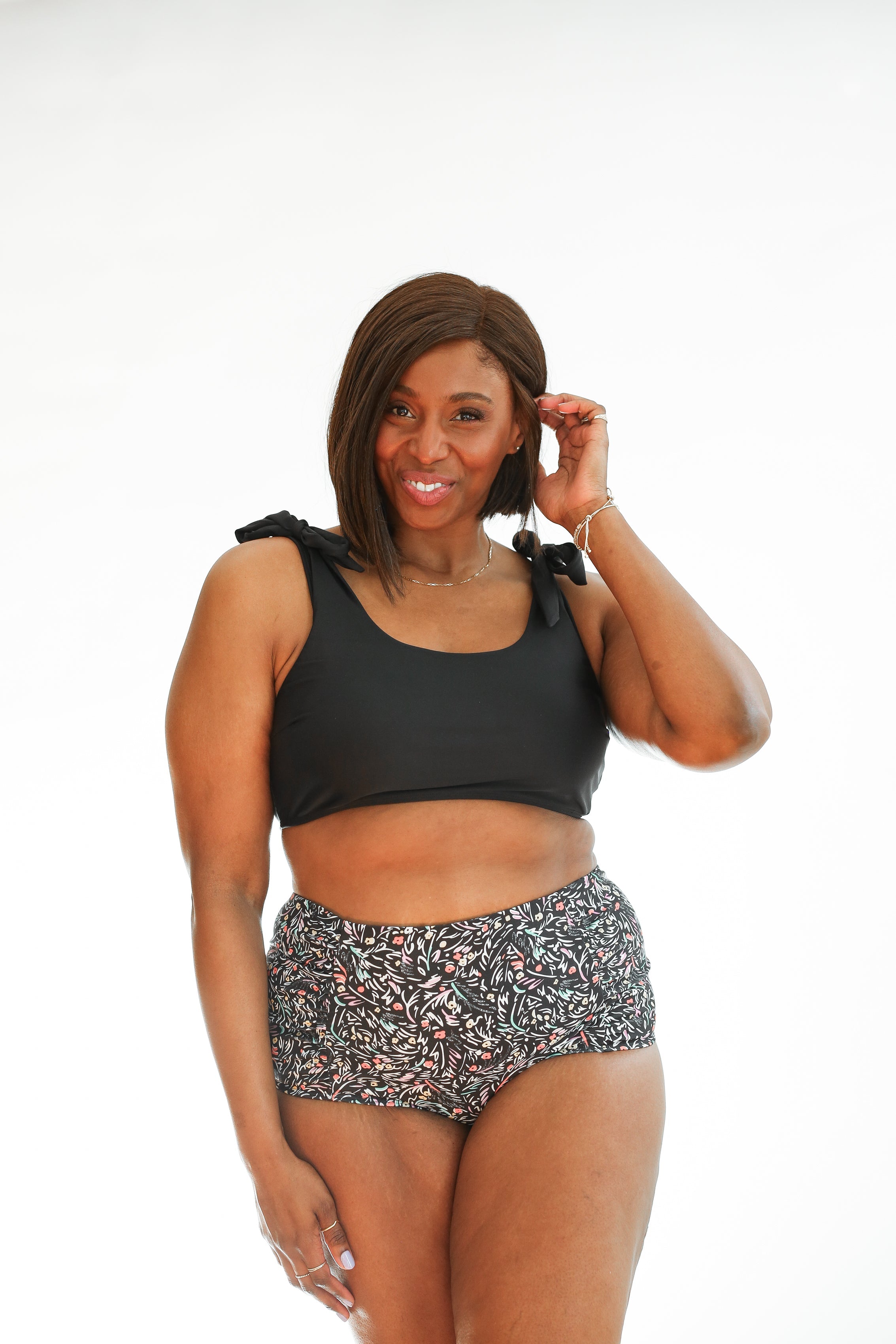 Kiah (short bob hairstyle) is 5'10", wears a size 38D in bras and a 14/16 in jeans. She is wearing a size XL on top and bottom.